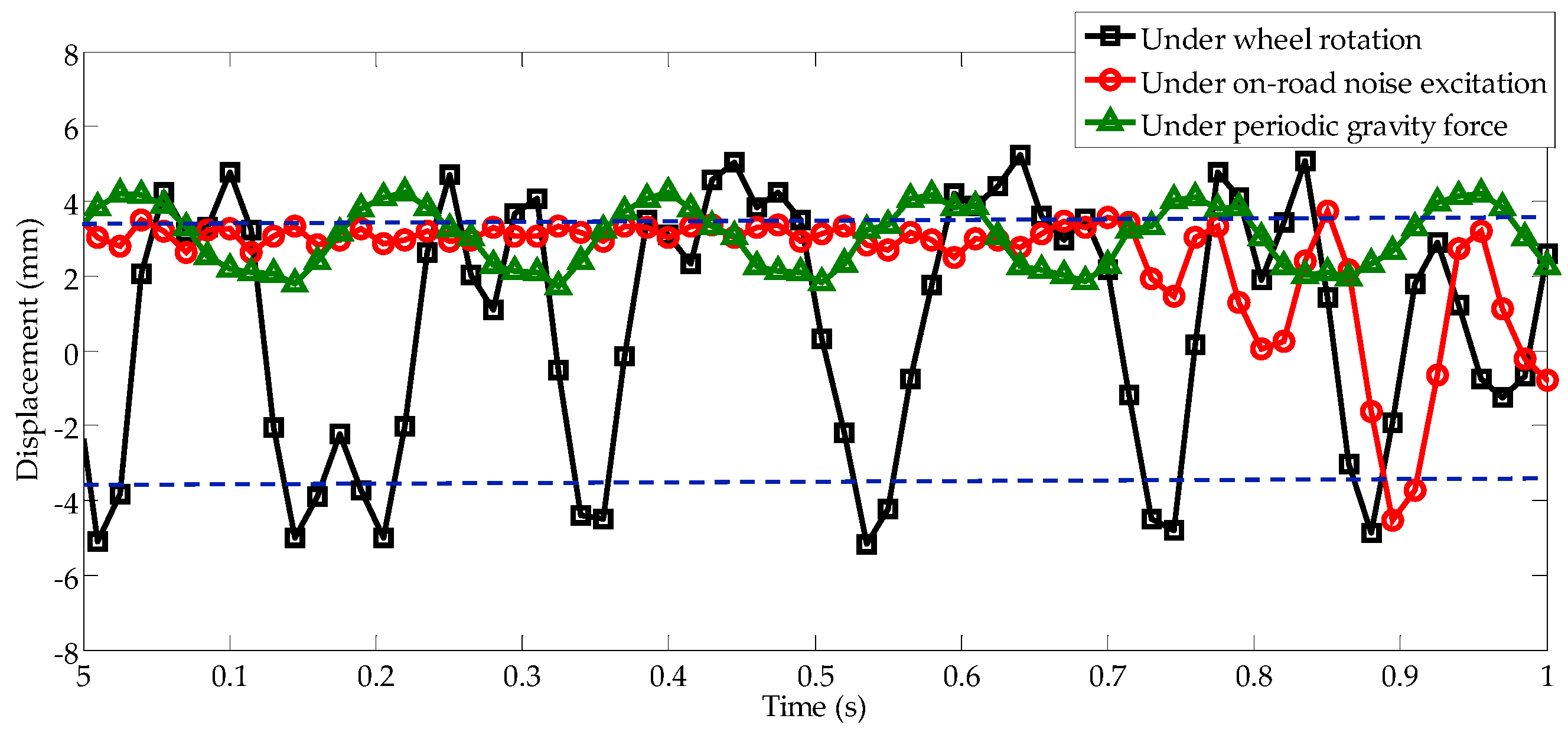 Displacement responses under three conditions: (1) on-road noise excitation; (2) periodic gravity force; and (3) wheel rotation combined with the on-road noise excitation and the periodic gravity force.