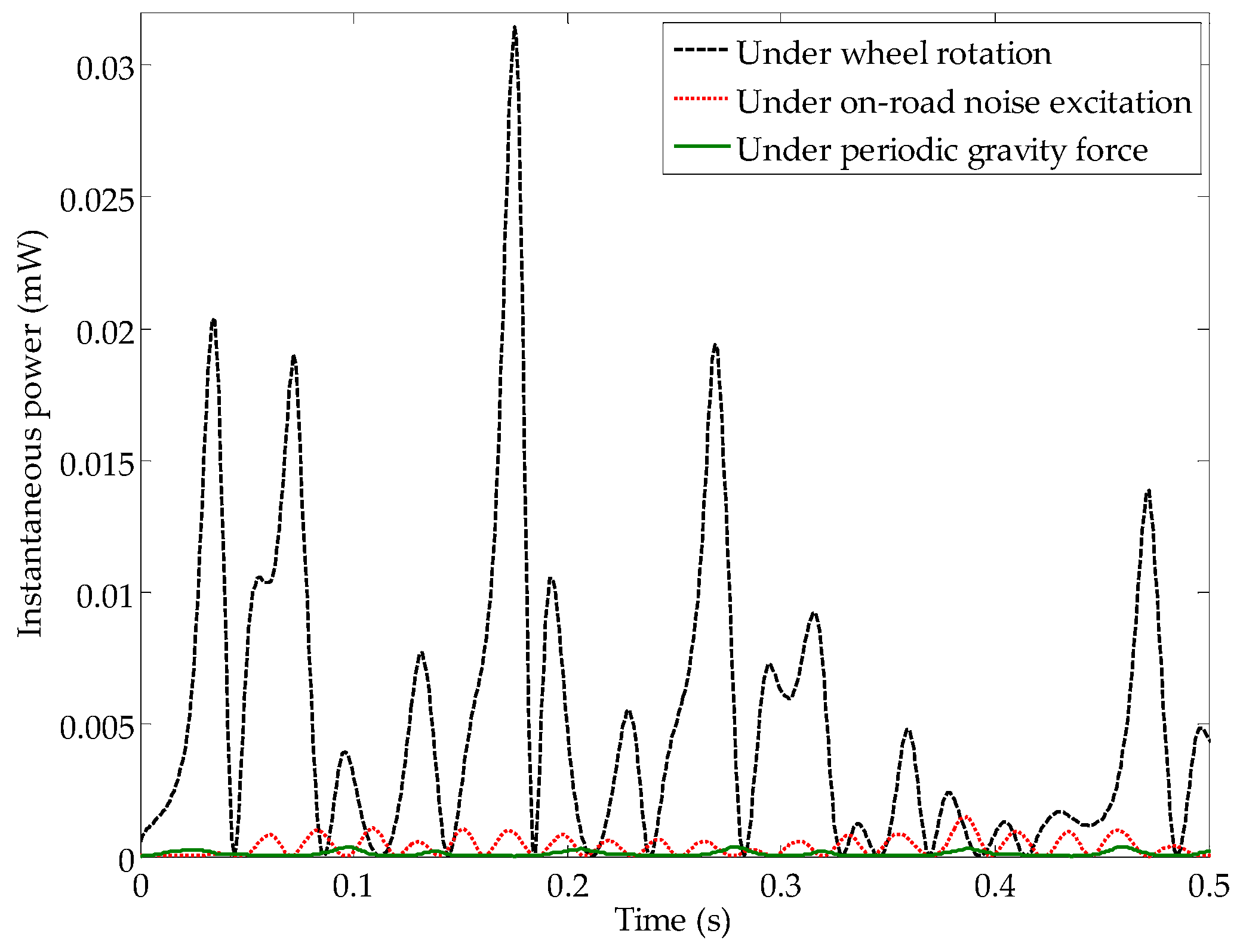 Figure 18c,d for the increasing vehicle speeds of the 30 km/h and 40 km/h, it becomes a tendency that the higher tire rotating angular velocity and on-road noise intensity resulted in higher collected power; nevertheless, the power generation levels are still lower than that of the 20 km/h for the case of stochastic resonance. Furthermore, as presented in