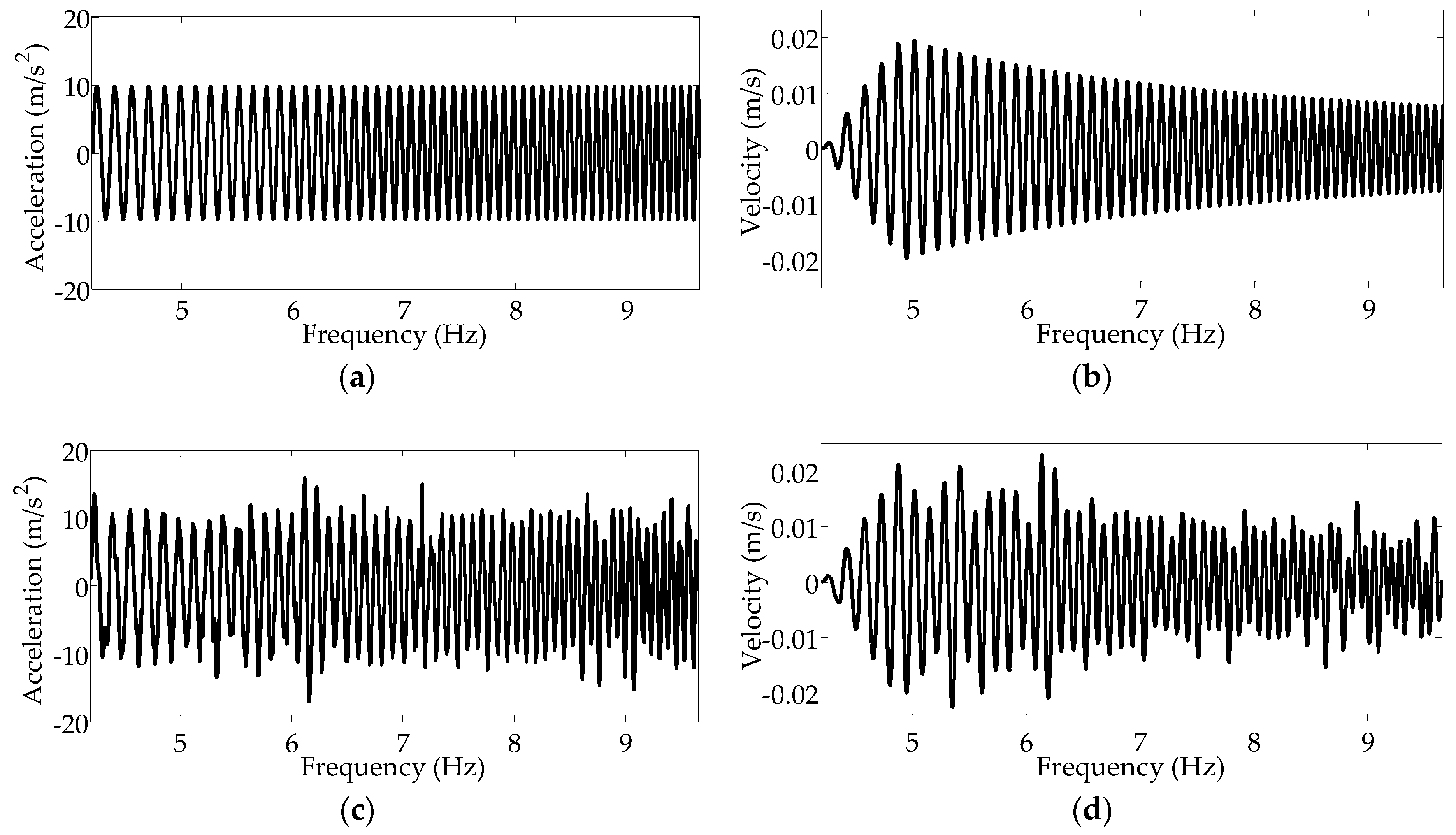 (a) Up-sweep excitation curve for gravitational acceleration; (b) up-sweep excitation curve for the corresponding velocity; (c) up-sweep excitation curve for gravitational acceleration in conjunction with the simulated on-road noise excitation; (d) up-sweep excitation curve for the corresponding velocity in conjunction with the simulated on-road noise excitation.