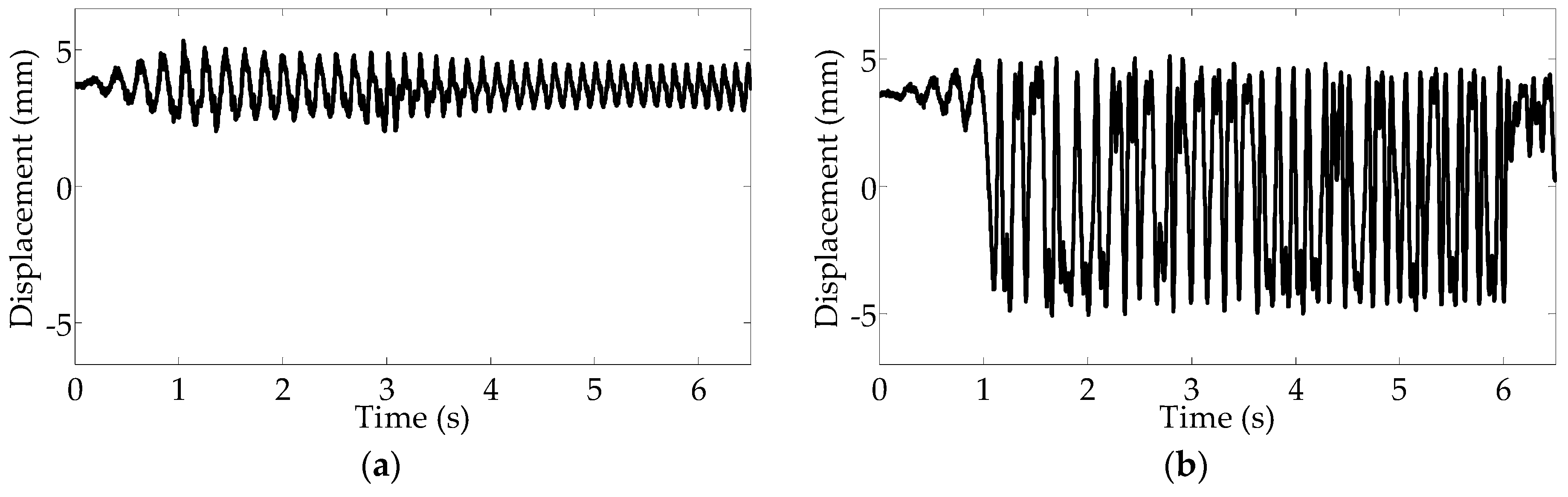 Experimental displacements: (a) under the up-sweep excitation; (b) under the combination of the up-sweep excitation and on-road noise excitation.