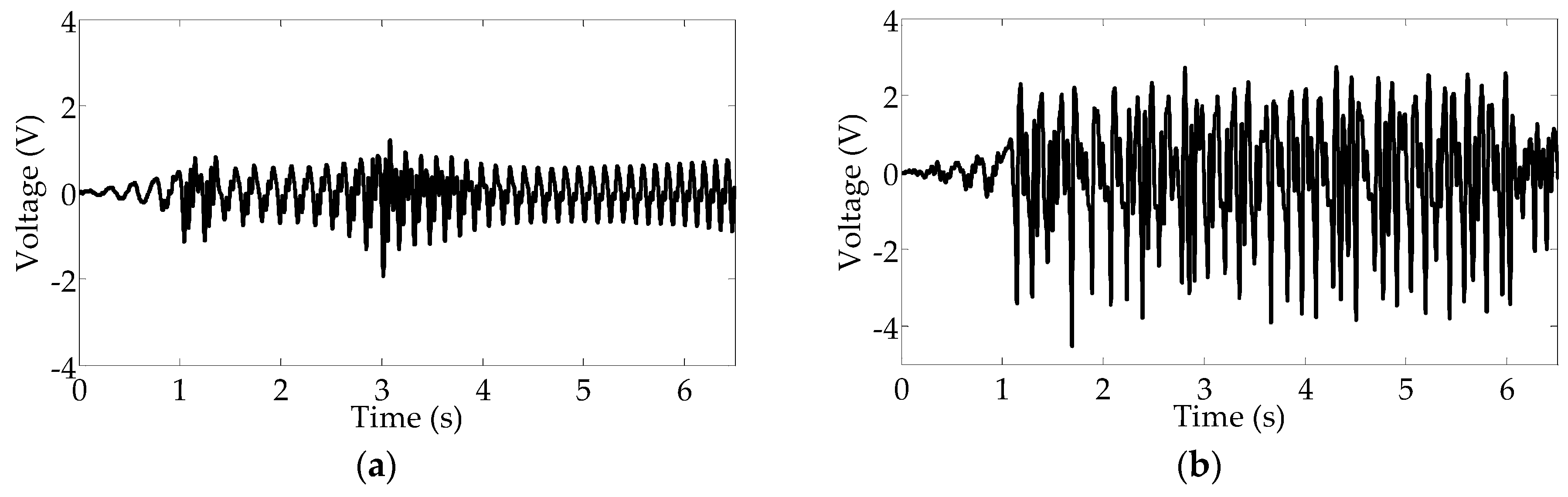 Produced voltages: (a) under up-sweep excitation; (b) under the combination of up-sweep excitation and on-road noise excitation.