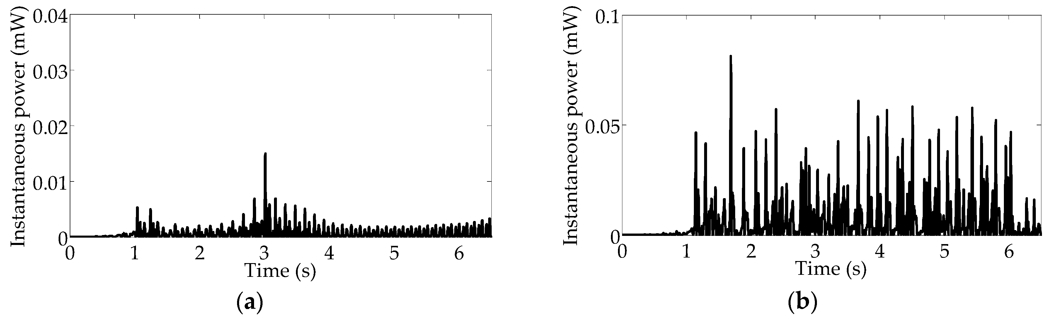 The low power density mainly resulted from the application of the piezoelectric material. In the experimental study, a unimorph ultrathin ceramic type of the piezoelectric material was applied with small dimensions of 22.9 mm × 10 mm × 0.1 mm. Moreover, when the matched load resistance of the piezoelectric material becomes high, the harvested power is decreased because the piezoelectric layer has a small electrostatic capacitance of 115 nF. In addition, it should be noted that the prototype of the energy harvester has to include a wireless motion recorder, accelerometer, data acquisition system, and the foundation support, to accomplish whole experimental procedure.
