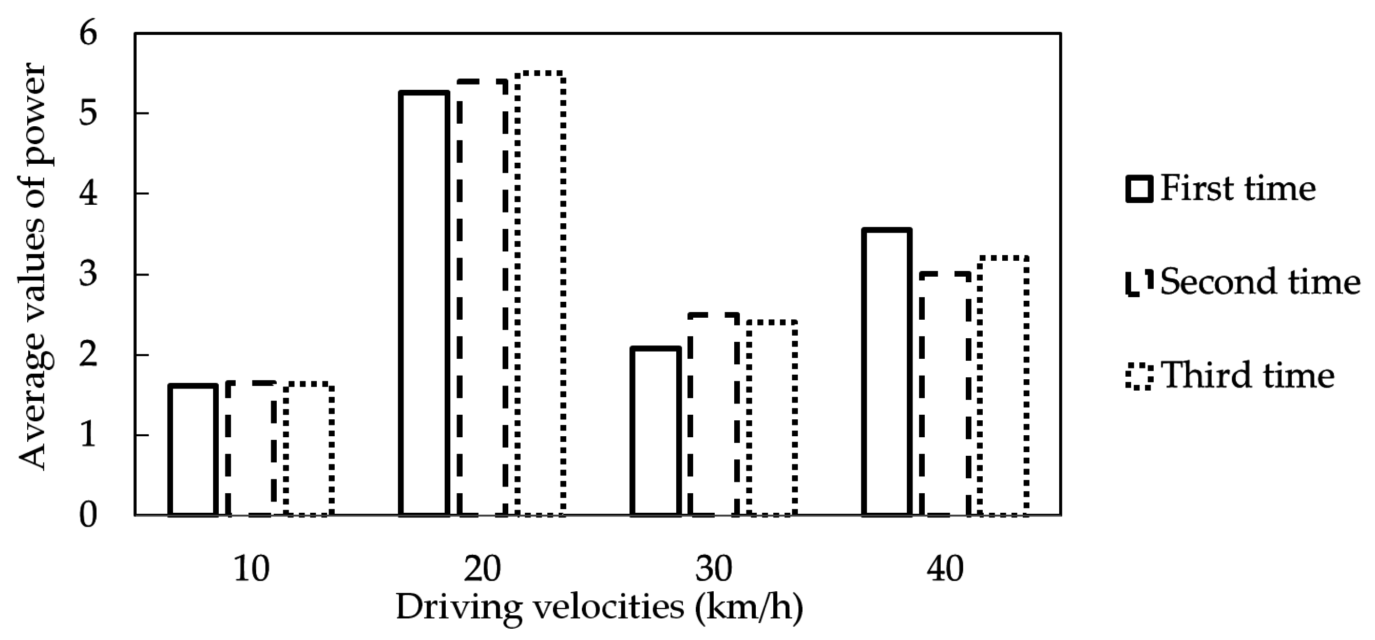 Figure 19, it is indicated that the average values of the collected power can be obviously enhanced at the velocity of 20 km/h compared to the other three different driving conditions. Meanwhile, this tendency is also validated by implementing the test three times for every speed.