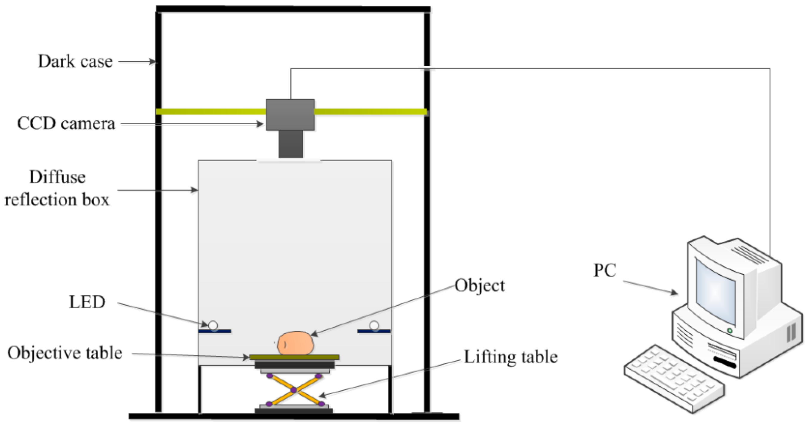 The experimental setup used for visible imaging is shown in Figure 2. The system consisted of a dark case to diminish the influence of ambient illumination, CCD camera (DVP-30GC03E; The Imaging Source, designed in Germany), LED lamps (18 W; Langtuo Inc. Hangzhou, China), an objective table and a lifting table, a diffuse reflection box, which is made of Teflon to make sure the incident light on the objects soft and even, and a PC. The CCD sensor is ICX445AQA, with 1.25 M effective pixels. The number of active pixels is 1280 (Horizontal) × 960 (Vertical). It bears the advantages of high resolution, high sensitivity, low dark current and low smear. It is important to make sure the injured area is in the middle of the field of view when capturing images, and accounts for about 25% of the whole captured image.