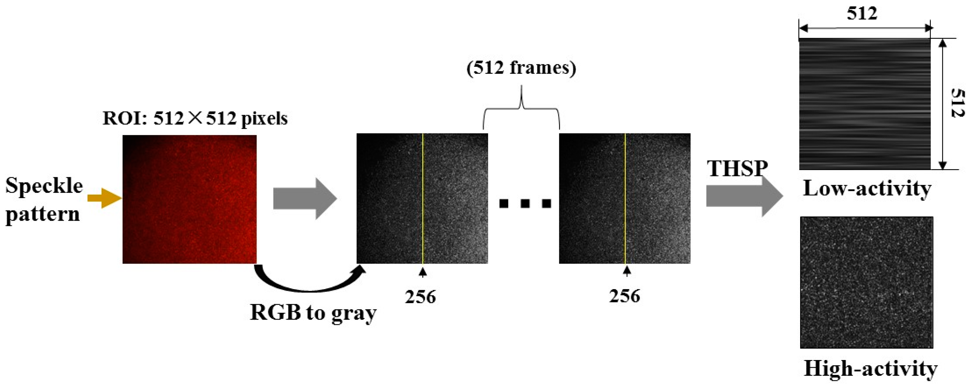 Dynamic speckle (biospeckle) is demonstrated by a temporal sequence of images, and BA can be computed from these sequential images by various methods. The THSP-based IM (Time History of the Speckle Pattern-based Inertia Moment) method [27] was used to quantitatively assess BA in this paper. The THSP [28] is a matrix composed of a number of successive images. The THSP is created using the same column extracted from each image and placed side by side. The set of columns is arranged sequentially in chronological order. The width of the THSP is equal to the number of images used and represents the time scale of BA. The formation of THSP is illustrated in Figure 4.