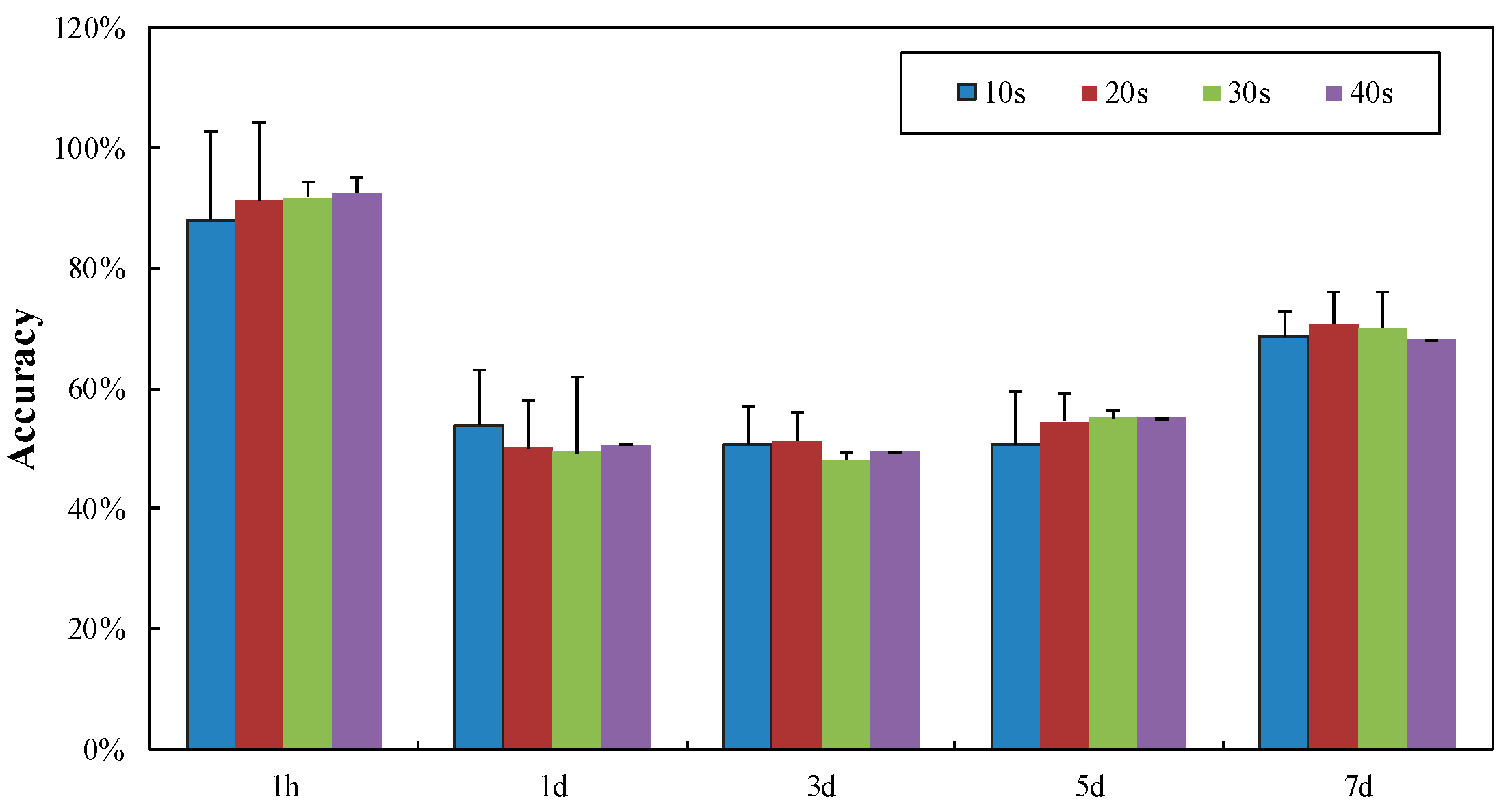 BA calculated by speckle patterns within 10 s, 20 s, 30 s and 40 s were employed as the features into BLR to discriminate injured skin after 1 h, 1 d, 3 d, 5 d and 7 d from sound skin, as illustrated in Figure 8. It can be seen that classification performances of BLR with BA calculated within different time spans were similar, demonstrating the feasibility of using 10 s as the capture time of speckle patterns instead of 40 s. Classification result within 10 s was acceptable for sound skin and injured skin storing for 1 h, with the accuracy of 88.10%. In addition, classification performance for injured skin within 1 h was much better (p < 0.05) compared with other storage periods, and the classification accuracy decreased afterwards.