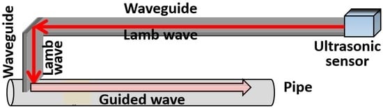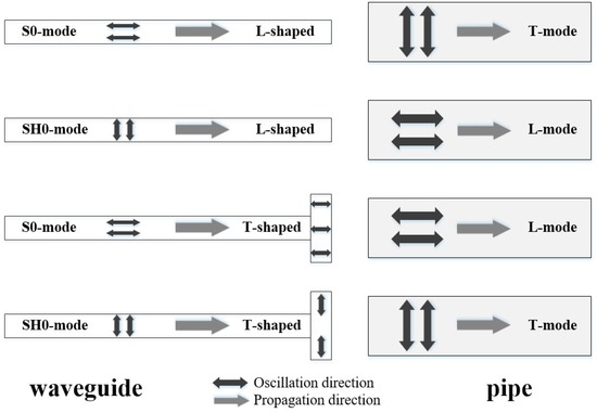 Therefore, a sensor system for high-temperature pipe inspection, which can transmit and receive ultrasonic guided waves using a long waveguide, has been developed by Murayama [16]. As shown in Figure 1, the tested pipe was wound with a long plate as the waveguide, which could keep the ultrasonic sensor away from the high-temperature pipe. The S0-mode lamb wave was excited in the plate-waveguide as the source, and it has been proved that the S0-wave can convert to the longitudinal mode guided wave in the pipe with the T-shaped waveguide and to the torsional mode guided wave with the L-shaped waveguide [16], as shown in Figure 2. However, the longitudinal and torsional mode guided waves have different detection abilities for different types of defects due to their different oscillation patterns, thus both of them are always employed for a comprehensive pipe evaluation [6,16,17,18]. Therefore, in this system, if the transformation of testing wave from the longitudinal mode to the torsional mode is required, the waveguide will be converted from the T-shaped to the L-shaped fixed on the high-temperature pipe, which cannot be easily executed in practice.