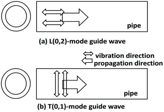 The axially symmetric L(0,2) and T(0,1) modes are the most widely-used modes for pipelines [19]. The oscillation patterns of the L(0,2) and T(0,1) mode guided waves are shown in Figure 3, in which the oscillation direction of L(0,2) is parallel to its propagation direction, but for T(0,1) mode, the oscillation direction is perpendicular to the propagation [16].