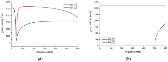 The dispersion curves of group velocity in the pipe: (a) longitudinal mode and (b) torsional mode.