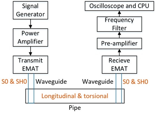 In recent years, the ultrasonic guided wave testing method has been widely applied for pipe inspections as it carries major advantages such as low attenuation, long distance propagation, and high detection efficiency [2,3,4,5,6]. There are two techniques which are commonly employed for generating guided waves: the piezoelectric transducer and electromagnetic acoustic transducer (EMAT) [2]. However, the piezoelectric ultrasonic testing requires a good sonic contact with the test piece, which restricts its inspection ability for certain applications, especially under high-temperature conditions [7,8]. EMAT has the ability to generate and detect ultrasonic waves without making a contact with the test object which makes it suitable to inspect high-temperature pipes with a large lift-off. Even though the EMAT still requires a cooling system which causes many issues [9,10,11], in addition, the lift-off effect also influences the results [12,13,14,15].