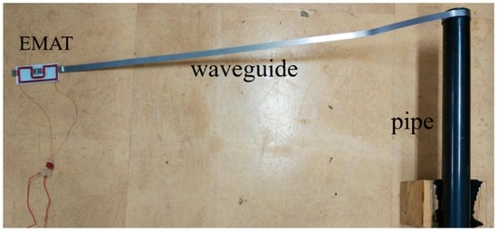 As shown in Figure 7, the experimental system consists of a function generator and a power amplifier, which generates the 100 kHz frequency and six volt amplitude electric power with four cycles of burst shape, and is amplified 20 times, then input to an electromagnetic induced coil, a pre-amplifier and a frequency filter, which amplifies the received signal by 50 dB, and selects the signal between 50 kHz and 200 kHz, and an oscilloscope and central processing unit (CPU), which collects and evaluates the received signal. The two waveguides of 1 m long, 10 mm wide and 0.6 mm thick plate were separately connected around the pipe, and the transmit EMAT and receive EMAT were placed on the terminal of the waveguides. Figure 8 shows the part of the experimental system which consists of the EMAT and the waveguide winding around the test pipe.