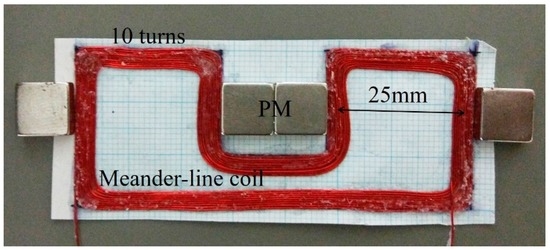 The meander-line coil EMAT has been widely used to excite a lamb wave in a plate-waveguide [25]. In this study, permanent magnets (PM) were used to provide a static magnetic field. The PM was 10 mm in length, 10 mm in width and 4 mm in thickness, and the magnetic field density at the surface was 326.4 mT. As shown in Figure 9, the meander-line coil was made of copper wire with a diameter of 0.315 mm, and the pitch between the meander lines was equal to half the wavelength of 25 mm according to the drive principle.