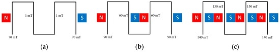 In order to excite a pure S0-mode lamb wave in the waveguide, the meander-line coil EMAT was optimized. First of all, to produce the best static magnetic field, the configuration of the permanent magnets above the coil was tested in the free waveguide whose dimensions were presented in Table 1. The transmit EMAT and receive EMAT were separately placed on each side of the waveguide, and there were three reasonable configurations of the PMs to be tested as shown in Figure 10. The densities of the static magnetic field were measured in these three configurations using a gauss meter, also shown in Figure 10.
