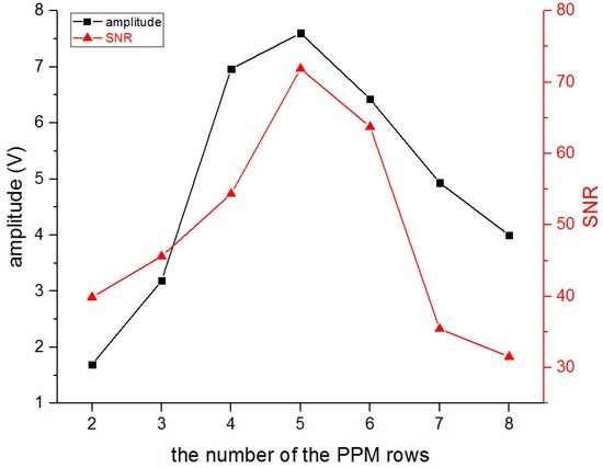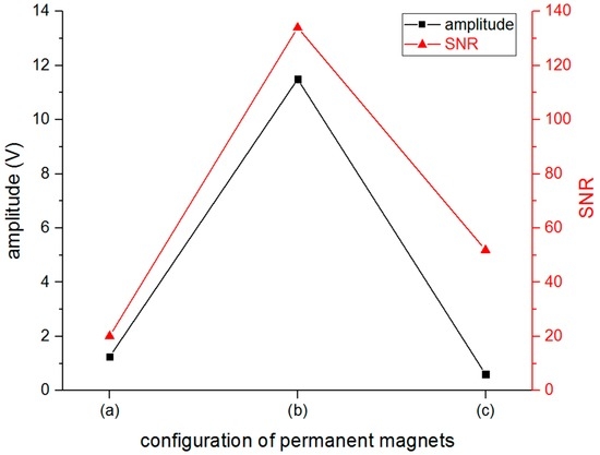 The amplitude and signal to noise rate (SNR) value of the S0-wave were computed from the received signal, then, these three configurations were compared to determine the best one, just as in Figure 11. It indicated that the amplitude and SNR could reach the highest values when the 4-PM configuration was selected from these three candidates.