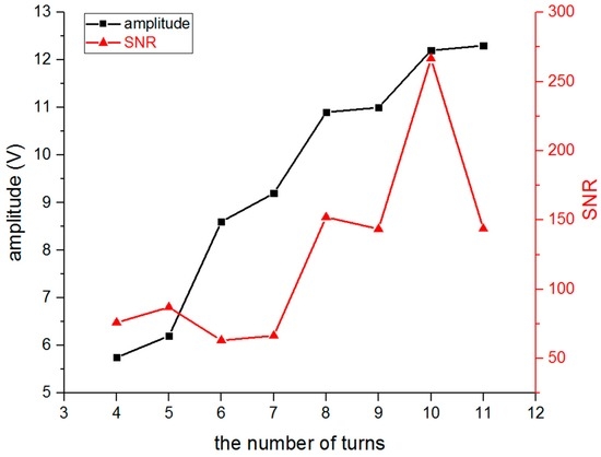Next, the number of turns of the meander-line coil was optimized. The test was conducted while changing the number of turns from four to eleven, and the capacitance, inductance, resistance, and impedance of each coil were measured using an LCR (inductance, capacitance, resistance) meter as shown in Table 2. Figure 12 shows the relationship of how the amplitude and SNR of the S0 wave varied while the number of turns increased. It also shows that the amplitude increased with the increasing number of turns, and the SNR obtained the maximum value when the number of turns was equal to ten.