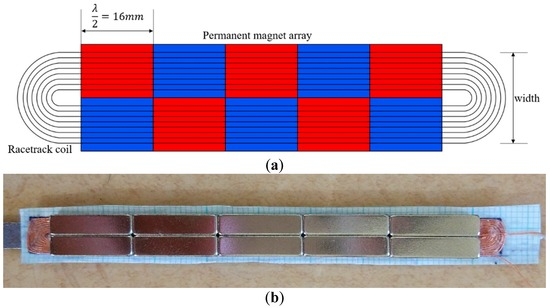 To generate an SH0-mode guided wave, the periodic permanent magnet (PPM) EMAT [26,27,28] was employed in this study. The PPM EMAT consisted of a racetrack-shaped coil with a magnet array on top (two columns and several rows of alternating polarity magnets) as shown in Figure 13. The racetrack coil had a 5 mm width with eight turns of 0.2 mm diameter wire. The permanent magnet was as long as half the wavelength of the SH0 wave, and the magnetic field density at the surface was 281.1 mT.
