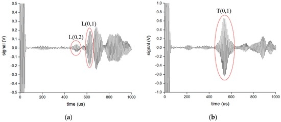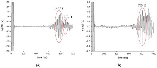 The experiments were then processed in the mode conversion from S0 and SH0 to the longitudinal mode and torsional mode guided waves, respectively, using the opposite waveguide to confirm the previous assumption. The distance between the two waveguides was set at 0.5 m, 1 m, and 1.5 m to verify the received results. Figure 16 and Figure 17 present an example of the received signals converted from the S0 wave and SH0 wave, respectively, when the distance between two waveguides is 0.5 m and the length of the waveguide is 1 m. The velocities of the L(0,2) mode, L(0,1) mode, and T(0,1) mode are about 5200 m/s, 2300 m/s, and 3200 m/s, respectively, from the developed dispersion curves. We could then compute the transmit time for each mode of guided wave and speculate which waveform was the objective mode as labeled in the Figure 16 and Figure 17. This was the same with the signals when the distance between the waveguides was 1 m and 1.5 m. From the received signals, it can be proven that the SH0-mode guided wave can successfully convert to the longitudinal mode and torsional mode guided waves with the opposite waveguide of the S0-wave, and the method of shifting the EMATs to change the mode of the guided wave in the pipe can be implemented.