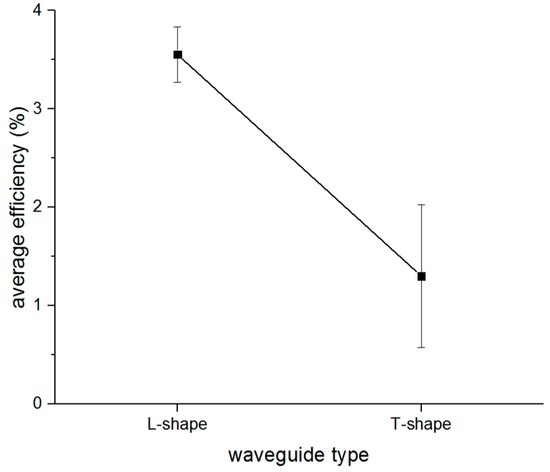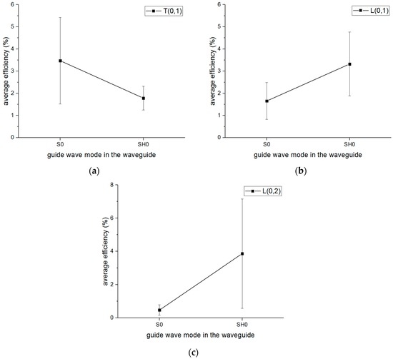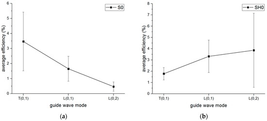 In addition, the average efficiency of the different mode conversions could be calculated when the same waveguide was used. For example, the average efficiency of mode conversions including S0 to T(0,1), SH0 to L(0,1), and SH0 to L(0,2) can be regarded as the efficiency for the L-shaped waveguide, and also the average efficiency for the T-shaped waveguide. The comparison between the efficiency of the two waveguides is shown in Figure 20, which indicates that the L-shaped waveguide had a better efficiency than the T-shaped waveguide no matter which mode guided wave was excited in the waveguide.