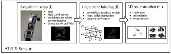 Schematic representation of our active triangulation system (ATRIS) sensor. The sensor comprises three key components: (i) an image acquisition procedure, which captures an image of the projected light pattern; (ii) a light plane labeling technique, which establishes the correspondence between all parts of the projected and detected patterns; and (iii) a 3D reconstruction procedure, which constructs a depth image from the detected light pattern.