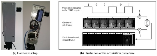 The acquisition procedure. (a) Visual appearance of the hardware setup of the ATRIS sensor. The left side of the image shows the casing of the sensor and the right side the arrangement of the camera (above) and the laser projector (below) in the casing. (b) Illustration of the modulated acquisition procedure.