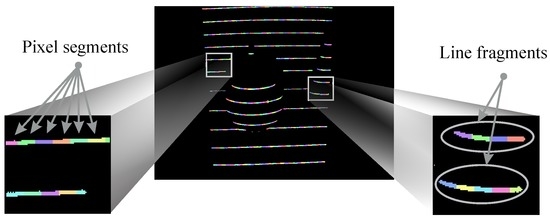 Visual illustration of some terminology used in this paper. Connected binary regions (using eight-adjacency) are referred to as line fragments. Smaller parts of the line fragments of fixed width are referred to as pixel segments.