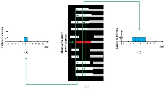 Assume that our goal is to compute the prior factor for the red pixel segment and that all other pixel segments in image I are shown in white and gray (Figure 7b). To compute the prior factor, we first scan over all x-coordinates of the red segment and for each x-coordinate search for (at most M) line fragments above and below the current x-position of the red segment. We then label the pixel segments found at the current x-coordinate consecutively from the bottom of the image up and increase the likelihood of the label assigned to the red-segment by some arbitrary constant q. If we are able to find M pixel segments at the given x-coordinate, only the likelihood of a single label is increased (shown by the graph in Figure 7a), whereas the likelihood of several labels is increased if fewer than M pixel segments were found (shown by the graph in Figure 7c). The procedure aggregates the likelihoods over all x-coordinates of the red pixel segment and in the final step normalizes the likelihoods to the unit norm over all light plane labels to produce the final prior factor for the corresponding random variable.