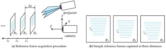 Illustration of the reference frame acquisition procedure: (a) the setup; (b) sample reference frames captured at distances , and . The reference frames are used to compute the depth value of each pixel segment in the labeled distortion map.