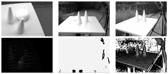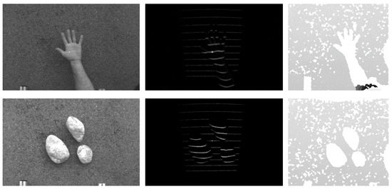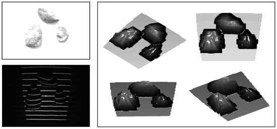 Once the light plane labels have been assigned to all parts of the detected light pattern, depth images of the observed scene can be reconstructed using the procedure presented in Section 5. To demonstrate the result of this process for our ATRIS sensor, we again present a couple of illustrative examples. The first example, which is shown in Figure 17, shows a number of stones with relatively simple geometry. The stones were placed on a street outdoors, and an image was captured using a commercial camera (upper left corner of Figure 17), as well as our sensor. Note that, despite the exposure to relatively strong incident sunlight, the sensor was able to capture an image with the projected pattern clearly visible (lower left corner of Figure 17) and reconstruct the depth images quite well (right side of Figure 17).