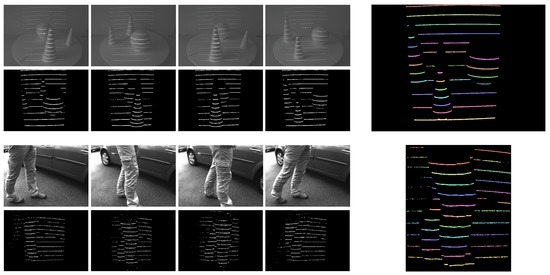 As illustrated in Figure 2b, all sub-frames captured during the on state of the laser are added to the superposition, and all sub-frames captured during the off state are subtracted. This demodulation procedure is implemented in FPGA and removes most information about the appearance of the target scene from the generated image/frame, thus significantly emphasizing the projected pattern. A thresholding step is ultimately applied to the demodulated image to remove all remaining (scene-related) artifacts and to produce the final binary image of the projected pattern needed for the light plane labeling.