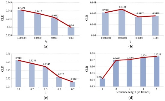 Impact of various hyper-parameters of the proposed technique on the labeling accuracy (measured in terms of the CLR). The results were generated on the indoor dataset and, except for the graph in the lower right corner, were computed using a sequence length of one. (a) impact of the overlap-cost parameter , (b) impact of fraction-cost parameter , (c) impact of the function drop rate h, (d) impact of the sequence length.