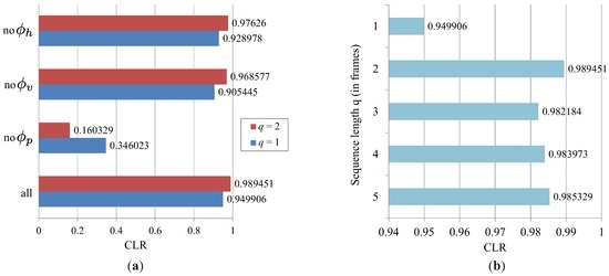 Figure 14 shows that the fraction cost (see Equation (3)) and overlap cost (see Equation (5)) have only a little effect on the labeling accuracy (graphs in the top row), whereas the function drop rate h (see Equation (5)), on the other hand, has a significantly larger impact on the labeling accuracy (graph in the lower left corner of Figure 14). These results suggest that the parameters and can be selected over a wide range of values with no significant performance loss, whereas h needs to be kept sufficiently small to ensure good performance. The most interesting observation of this series of experiments, which supports our working hypothesis that temporal information can improve labeling accuracy, can be made from the graph in the lower right corner of Figure 14. Note how the accuracy of the labeling procedure improves when two consecutive images from a sequence are used for constructing the PGM instead of only one. Adding additional images to the sequence further improves the labeling performance, albeit to a lesser extent. The best labeling accuracy we manage to achieve on the indoor dataset is a CLR of 0.9755 given a sequence length of five.