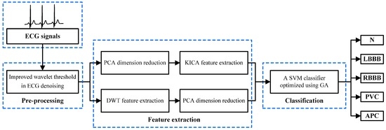 Block scheme of the proposed electrocardiogram (ECG) recognition system for ECG beats classification. The presented system is composed of ECG pre-processing, feature extraction and classification. ECG pre-processing removes noise and interference from original ECG beats. Feature extraction derives multi-domain features through kernel-independent component analysis (KICA) and discrete wavelet transform (DWT). The support vector machine (SVM) classifier, optimized with genetic algorithm (GA), divides ECG beats into five categories: normal beat (N), left bundle branch block beat (LBBB), right bundle branch block beat (RBBB), premature ventricular contraction (PVC) and atrial premature beat (APC).