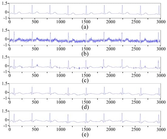 With the progress of science and technology, automatic analysis and diagnosis systems based on electrocardiogram (ECG) signals have been extensively investigated to detect and diagnose cardiac diseases [1,2,3,4,5]. The use of an ECG automatic analysis and diagnosis system not only reduces the workload of doctors but also improves diagnostic efficiency and accuracy. ECG is a synthesized reflection of heart electrical activity in the human body used to obtain the cardiac rhythm and electrical conduction of physiological and pathological information [6,7]. However, ECG signals are often mixed with various noises and artefacts. As a result, examiners experience difficulty distinguishing normal signals from arrhythmia signals. Pre-processing of ECG signals is necessary to reduce various interferences. Some techniques based on digital filters have been employed to remove noise and power-line interference from biomedical signals [8,9,10]. Other mathematical morphological algorithms are applied in signal pre-processing [11,12]. Wavelet transform (WT) method based on its good time-frequency property for signal denoising have been popularly developed and applied to eliminate noise effectively in ECG identification system [13,14,15,16]. In addition, an adaptive filtering algorithm for ECG denoising was proposed and compared with the denoising method based on wavelet shrinkage [17]. An approach based on empirical mode decomposition and an improved approximate envelope method was also presented for ECG signal processing [18].