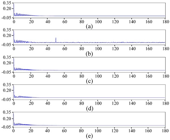Spectrum of different signals. (a) Spectrum of the original signal; (b) Spectrum of the noisy signal; (c) Spectrum of the signal denoised by the soft threshold function; (d) Spectrum of the signal denoised by the hard threshold function; (e) Spectrum of the signal denoised by the improved threshold function.