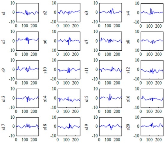 Feature subspace obtained through kernel-independent component analysis (KICA). (s1–s20) are 20 independent base signals, x-axis represents sample points of the ECG signal and y-axis is the amplitude.