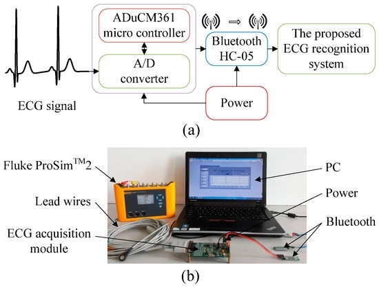 We construct an ECG acquisition experimental platform to collect ECG data for arrhythmia recognition to verify the validity of the proposed system. Fluke ProSimTM2 vital sign simulator is used as the signal resource to provide different types of ECG signals, and standard I lead ECG is selected in this platform. An ECG acquisition module is a critical part of the experimental platform and is integrated with an ADuCM361 (Analog Devices, Inc., Norwood, MA, USA) micro controller and an A/D converter (Analog Devices, Inc., Norwood, MA, USA) to acquire analog ECG signals and convert them into digital ones. The collected ECG data are transmitted via Bluetooth HC-05 (DX-Smart Technology Co. Ltd., Shenzhen, China) to a PC, and the data are then input into the proposed ECG recognition system for classification. The power module is used to supply electricity to the ECG acquisition module and the Bluetooth module. Figure 7 provides diagrams of the ECG acquisition experimental platform.