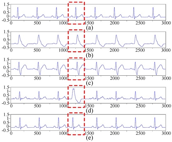 Five types of ECG signals acquired by the experimental platform. The ECG signals in the red dashed boxes are the five types of the acquired beats. (a) N; (b) LBBB; (c) RBBB; (d) PVC; and (e) APC.