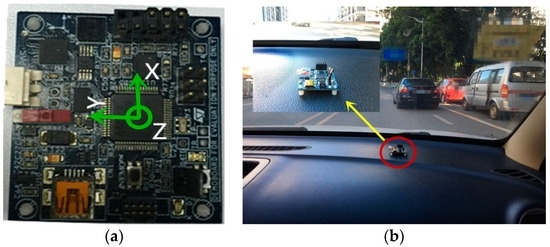 Setup of the board. (a) The axis pointing of motion sensor; (b) The placement of the board in the car.