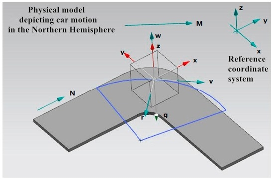 Furthermore, the variation of magnetic induction intensity information measured by the motion sensors is not only related to the vehicle behaviors but also connected with its geographic position. The distribution of the geomagnetic field decides the intensity and direction of all places on the earth. Similarly, it can also be divided into . To account for the change rule of data systematically, we, first and foremost, develop the physical model. Taking the Northern Hemisphere, for instance, the physical model is portrayed in Figure 4. The cube in Figure 4 represents a moving car. The red three-dimensional system of coordinates is set inside the motion sensor and the arrow marked with N points to the north. The two arrows with g and M represent the gravitational acceleration and geomagnetic field, respectively. Take RT for instance, the car moves along the blue arc with turning radius of r. Its linear velocity (the arrow marked with v) points to tangent direction of circular arc and according to Equation (2), the angular velocity is vertically upward (the arrow marked with w). In addition, the geomagnetic field has the downward direction in the area north of the equator. The magnetic field quantified by sensors will vary with the car in motion.