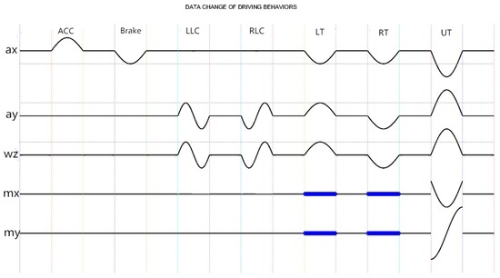 Based on the physical model we built and Equations (1) and (2), the change of data on behalf of different driving behaviors can be deduced and the outcome is demonstrated in Figure 5. Motion sensor is set up as described in Section 3. Furthermore, in the process of moving, five of the nine axes show data variation, which are , . The waveform in Figure 5 reveals the corresponding data change rule of specific driving behavior.