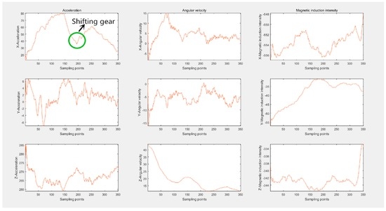 Given the space constraints, ACC and LT would be taken as examples to show the actual raw data. The data change of ACC is displayed in Figure 6. Among all nine axes, only suffers a large change. When accelerating, the longitudinal acceleration of the car will first increase and then decrease. An upwards convex main lobe and a side lobe resulting from shifting gears form the accelerating process of cars. Correspondingly, without shifting manually, the automatic cars complete the ACC just with an upward convex wave. Compared to the change extent of , the variation of the remaining eight axes can be ignored. Figure 7 portrays data change of LT. The of LT shapes a wave trough to decrease the longitudinal velocity, while and form a crest, respectively, which alters the orientation of velocity. Conforming to the theory of data change rule in Section 4, the actual data depicting driving behaviors proves the correctness and rationality of the proposed physical model.