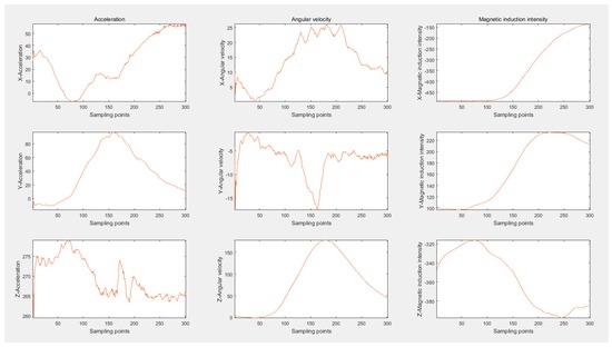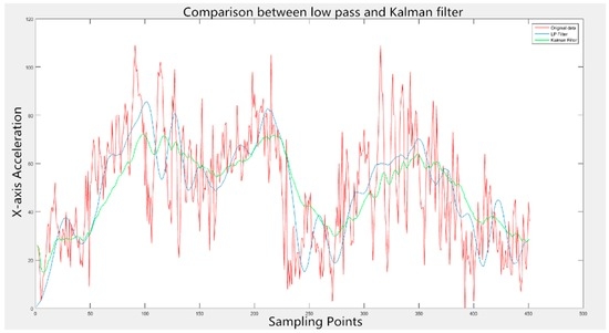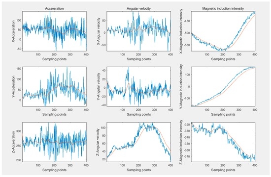 The performance of Kalman and low pass filters is compared in Figure 9. The red curve depicts original data acquired, with the blue one being the outcome of the LP filter and the green one representing the result of the Kalman filter. Obviously, though the whole changing tendency could be recognized, the original data is accompanied by overwhelming noise and the local changes are totally divergent from the data change rule. The LP filter possesses a quicker response to the original data, which causes the noises to exert more influence on data filtering and interferes with the smoothness of waveforms. Fortunately, the prediction-based Kalman filter can avoid the disadvantages mentioned above. When most noises are removed, the output data reserves most of the information contained in the original data and more consistently meets the data change rule in Figure 5, sufficiently enough to complete the subsequent work. Therefore, the Kalman filter is utilized to eliminate noises with the filtering effects of nine-axis signals displayed in Figure 10. The blue curves represent original data and the red ones demonstrate the filtered data.