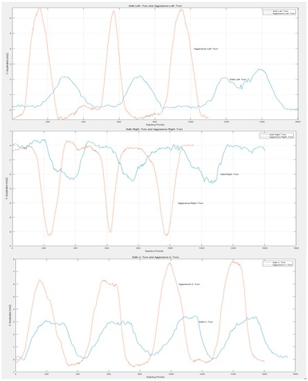 The blue curves in Figure 8 denote LT, RT and UT while the red ones describe A-LT, A-RT and A-UT. Apparently, the waveforms of aggressive behaviors suffer a sharper increase and decrease, a shorter duration and a larger domain for amplitude change. For instance, when turning left aggressively, cars can produce an over 6 , in contrast to the 2 of normal LT. These obvious differences provide the slope of data waves, the peak value and the duration of data change to facilitate the classification of normal and aggressive driving behaviors. The recognition of aggressive driving behaviors can contribute to evaluating the driving style of drivers and improve their driving by feeding the information of aggressive behaviors back in a timely manner.
