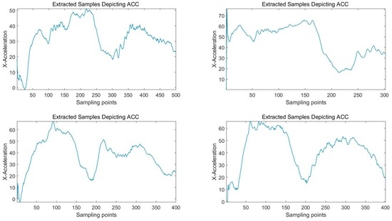 From Figure 6, we can see that just as , the data of other axes also suffers a smaller variation in the process of ACC. The variations will generate a gradient change and then affect the extraction of valid data. To avoid this effect, appropriate upper threshold is set after analyzing the collected typical samples. We reserve the data of this basic time window temporarily when the calculated exceeds , or send the data for other judgments otherwise.
