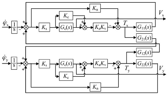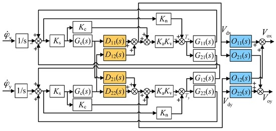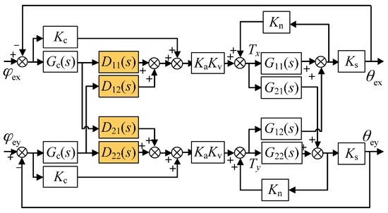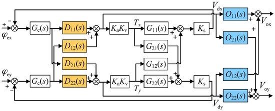 It can be noticed from Equation (8) that the cross-axis coupling between the two output voltages still exists after the inner-loop compensation is applied. In fact, the inner-loop compensator can effectively reduce the coupling between dual-axis angular positions ( and ), yet needs to be combined with the outer-loop decoupling compensator as in Equation (9) so as to eliminate the coupling between two output voltages and achieve full decoupling. It should be noted that the design of is based on the inner-loop compensated system.