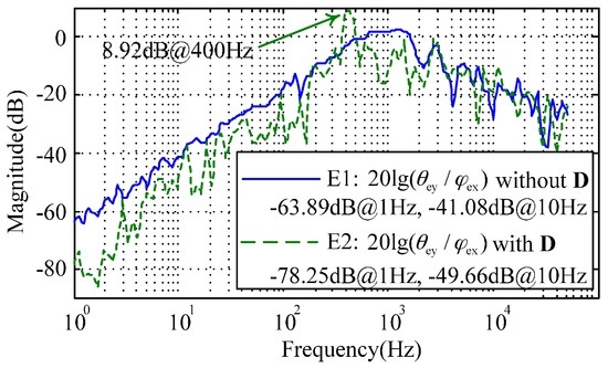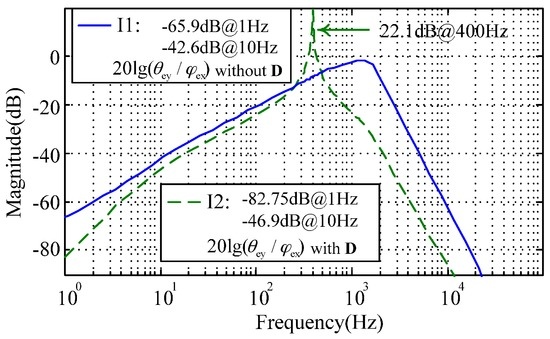 Equation (12) indicates the inner-loop decoupling compensation can eliminate the cross-axis coupling between the two angular position responses. Simulation results illustrated in Figure 6 show that the inner-loop decoupling (denoted by I2) can attenuate the coupling response of the angular position by 16.85 dB at 1 Hz. Besides, the resonance peak at 400 Hz demonstrates the nutation frequency response of the MESG operating at about twice the rated spin rate (200 Hz), which benefits from the proper stiffness compensation.
