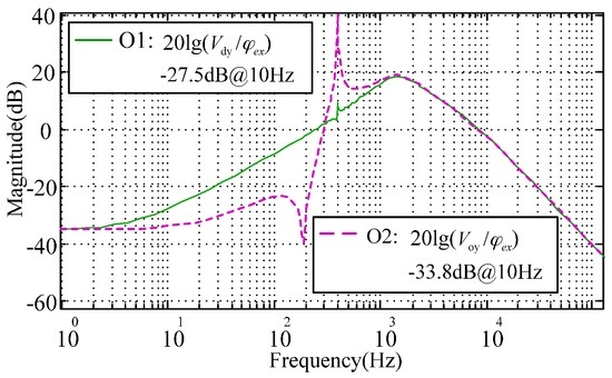 Further, the full decoupling of the rebalance loop can be realized by appending the outer-loop decoupling compensator . Figure 7 presents a test scheme to verify the characteristics of by setting as the input and as the responses of the coupling-axis outputs, respectively. Figure 8 compares the simulated cross-axis coupling responses with and without the outer loop decoupling compensators, where the inner-loop and outer-loop decoupling curve, O2, and the inner-loop decoupling curve, O1, correspond to the loop transfer functions and , respectively. Comparing Figure 8 with Figure 4, it is noted that the cross-axis coupling error becomes much higher. This is because the angular position usually keeps zero for the MESG operating at the angular rate measurement mode, and the input of the gyro rebalance loop is the external rate as shown in Figure 4. However, the input of Figure 8 is an electric angular position which is only used in the proposed electrical measurement mode to validate the decoupling compensation. It is clearly shown that the outer-loop compensation can suppress the coupling-axis output effectively in a frequency range of less than 200 Hz, for example, an attenuation by 6.3 dB at 10 Hz. The resonance peak of the nutation frequency appears at about 400 Hz as well, which is far beyond the MESG bandwidth which is typically less than 50 Hz. Note that the difference between Figure 6 and Equation (12) could be mainly attributed to the rounding error and accumulated error of the rebalance loop during numerical computation via Simulink.
