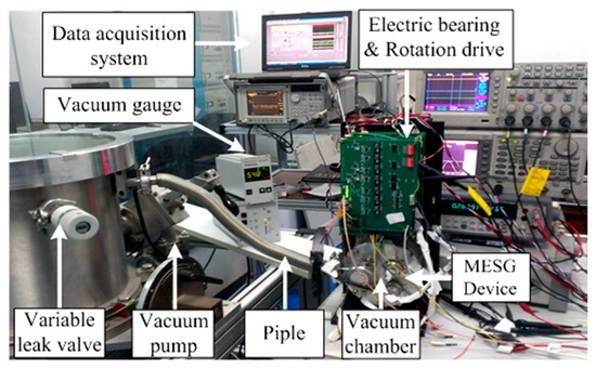 In our MESG setup, the rebalance loop shares the pick-offs of the angular position and the loop controller with the five-axis suspension loop. A lag-lead compensator is designed to be used as the loop controller Gc(s), which is realized digitally via a high-speed digital signal processor at a sampling frequency of 20 kHz [21]. The stiffness compensation which eliminates the negative spring effect in the electrostatic torquer acts as a pre-condition for operation of the proposed decoupling compensation realized in the rebalance loop. When the MEMS device runs at the angular rate measurement mode in which the rotor is spinning at a high speed over 104 r/min, the decoupling control compensation (inner-loop and outer-loop decoupling) must operate together to attenuate the inherent cross-axis coupling inside the rebalance loop. Figure 9 illustrates the MESG experiment setup. A small vacuum chamber is used to provide a desirable vacuum condition for the MESG device. It was maintained at high vacuum via a turbo-molecular pump, a vacuum gauge, and associated valves and pipes. The air pressure of the vacuum loop can be adjusted by a variable leak valve. A dynamic signal analyzer (Agilent 35670A) and a data acquisition unit are used in the gyro tests using the proposed stiffness compensation and decoupling control scheme.