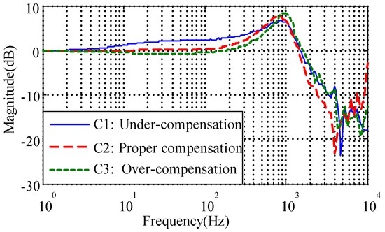 The negative spring effect of the electrostatic torquer has been discussed in Section 2.2. Determining how to verify the accurate stiffness compensation is crucial to obtain desirable full decoupling of the rebalance loop. While the MESG operates in a vacuum greater than 10−1 Pa, the control voltages need to be modified as indicated in Equation (3) to counteract the negative moment from . Then the compensated results can be observed and evaluated via measuring the closed-loop frequency response and suspension stiffness. To test the closed-loop frequency response, and are set as the input and output while and are set as the input and output in the following suspension stiffness frequency-sweeping test [7]. Three curves C1, C2, and C3 in Figure 10 indicate the under-, proper- and over-compensation in the closed-loop frequency responses, respectively. When the negative stiffness is compensated accurately, such as in C2, the magnitude-frequency curve obviously tends to be flat (at 0 dB) in the middle frequency band (from 10 to 100 Hz), which directly contributes to a stiffness increase of 30.3% compared with the under-compensation of C1, as illustrated in Figure 11. On the other hand, both the under- and over-compensated systems indicate a magnitude deviation from the desirable 0 dB line within the middle frequency range. It is also clear that the proper-compensation system has the smallest resonance peak. The smaller the resonance peak, the more stable the rebalance loop will be. Hence the closed-loop frequency response test is an effective method to observe and evaluate whether the suspension stiffness is compensated properly.