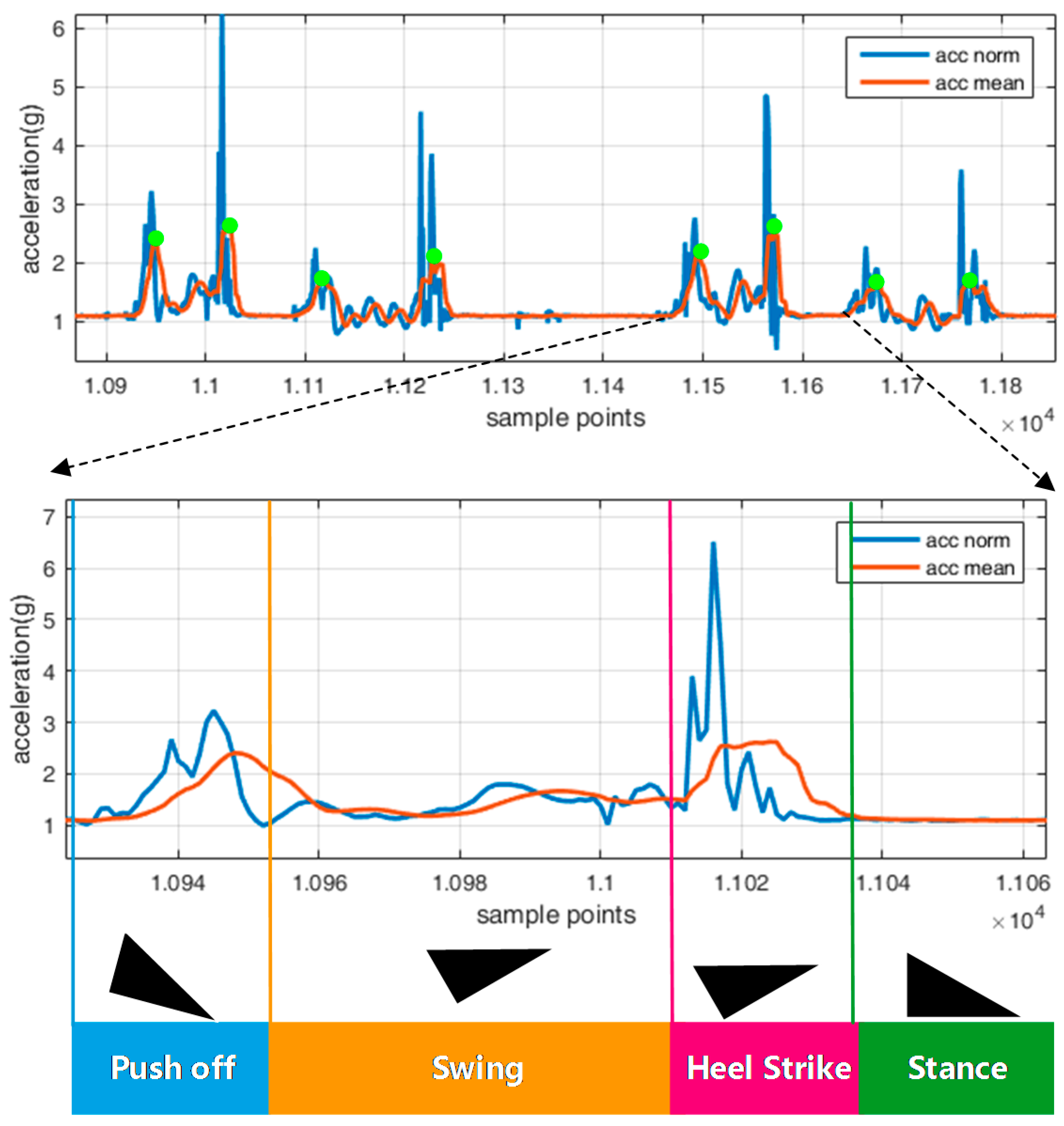 Figure 6 illustrates that the smoothed acceleration signal during one walking cycle generally features two peak points, one is in the push-off phase that the foot is leaving the ground and another one is in the heel-strike phase that the foot hits the ground. Although it may not hold for each walking cycle, that more than two peak points are available in one cycle, due to different user habits of motion strength, these two points are always available in each gait cycle. Here, the utilization of the peak point for triggering the date segmentation process is proposed. Once one peak point is detected, the feature in the vicinity of this point is extracted and consequently the foot motion type is identified.